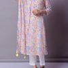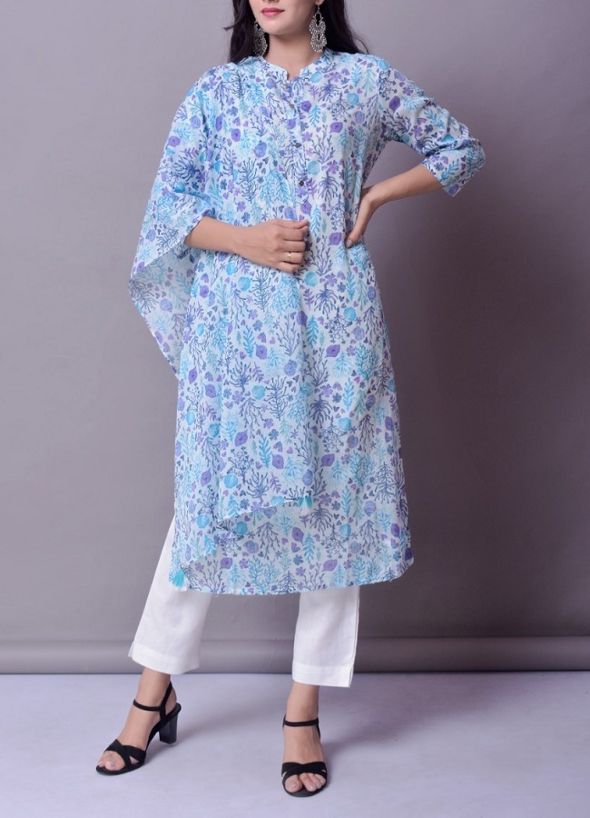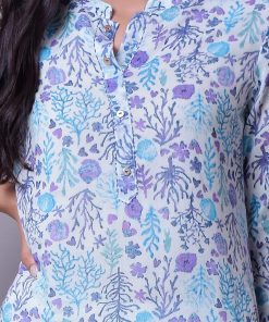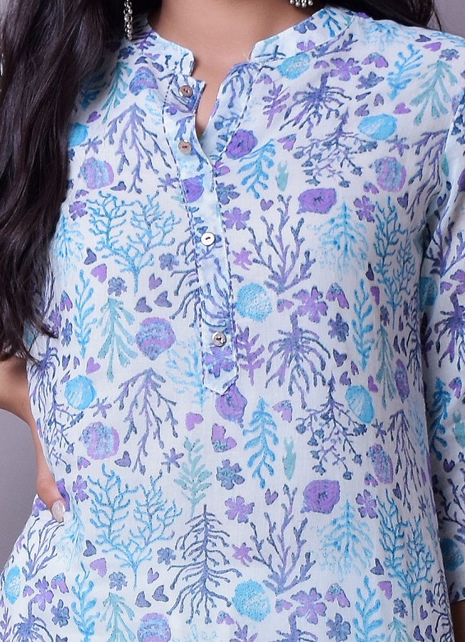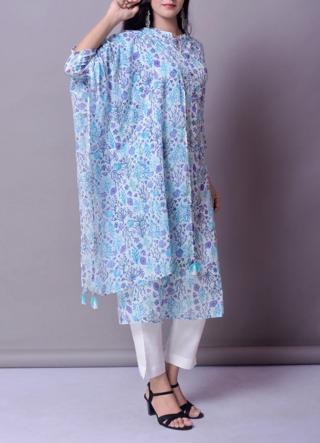 Premium cotton floral print kurti with lining inside and printed duppatta enriched with tassels and katha work around the buttons on the front.