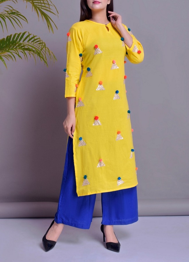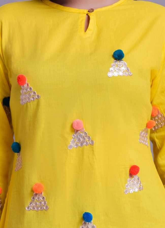Premium Cotton Kurti Palazzo set enriched with Gota Patti work and Pom Pom